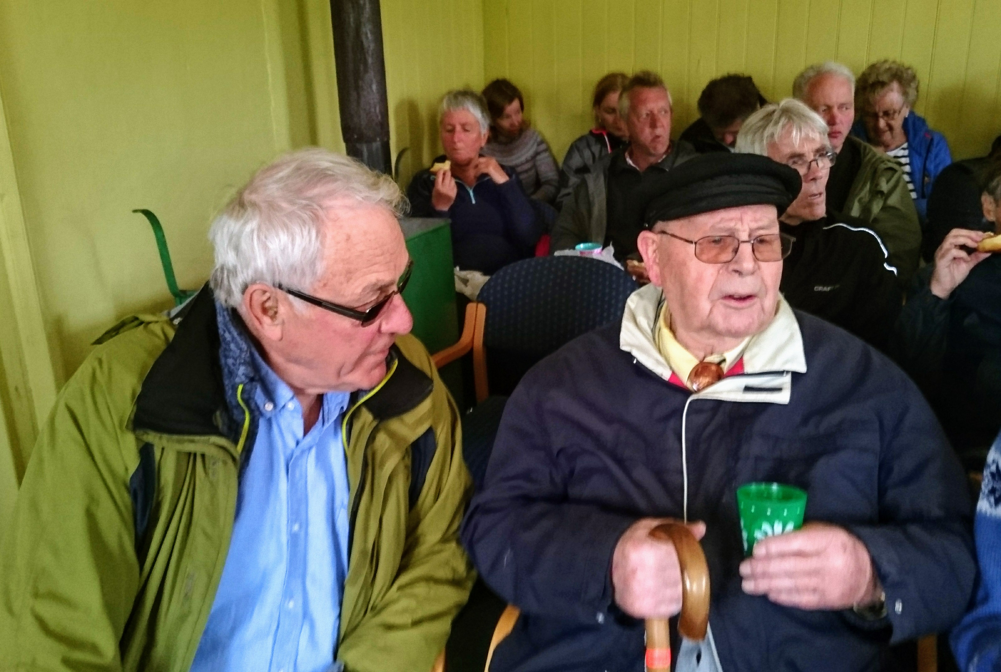 Rast på Inntjore skole. Olav Repstad og Helge Gundersen mimrer om skoledager for 72 år siden.